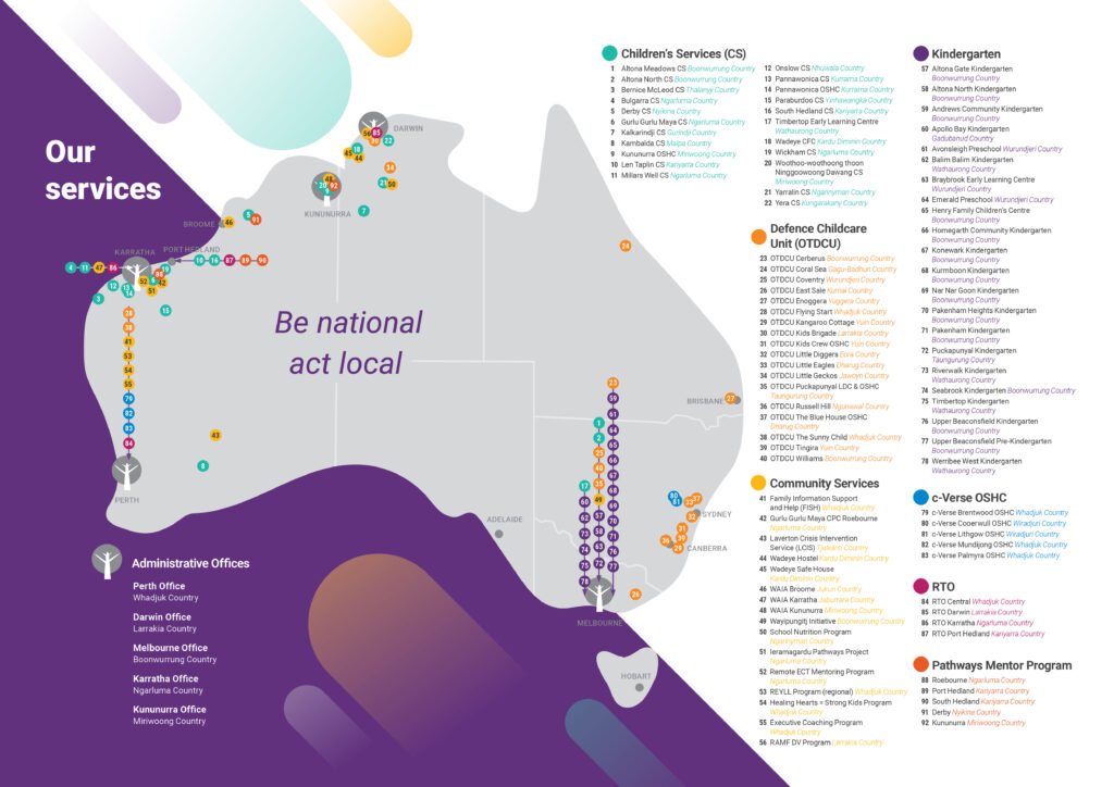With offices located in Perth, Melbourne, Darwin, Broome and Kununurra, we offer more than 100 services across three core areas: children’s services, community services and our Registered Training Organisation (RTO). We have a quiet reputation for delivering quality services, with expertise working with remote and rural communities.
