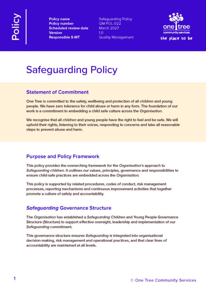 Email: childsafe@onetree.com.au - Submit a message or a concern via the below form.