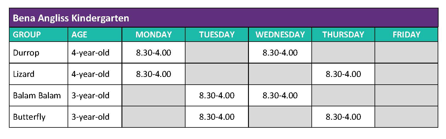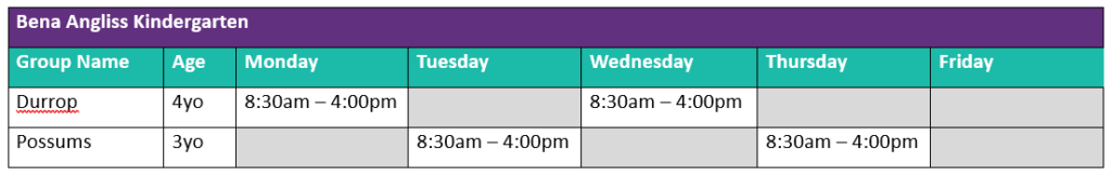 We offer funded kindergarten programs for both 3-year-olds and 4-year-olds, supporting local families with quality early childhood education. At Bena Angliss, we value family input and cherish our strong connections with the local community. We enjoy working collaboratively to provide diverse and meaningful learning experiences for our children.