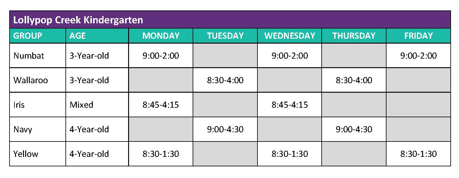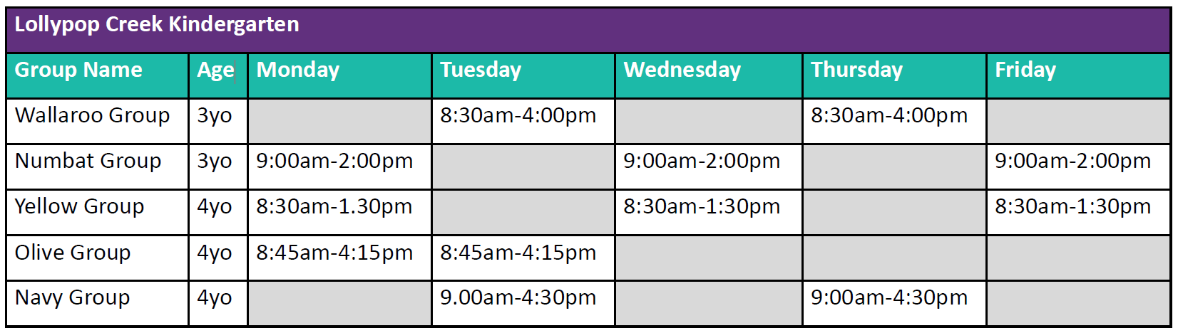 We are a 99-place service with three kindergarten rooms. Our service offers three and four year old kindergarten programs.